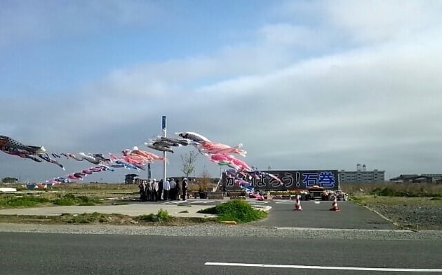 「がんばろう!石巻」の横に、なんと大きな大きなこいのぼりがありました!